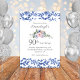 Blue and white, floral leaf, seamless, repeating pattern in background, a white flower shape layer, and templates created for a special birthday. A blue and blush pink floral arrangement in centre, "Happy Birthday" curved text above it.