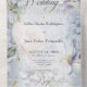 AVAILABLE WITH OR WITHOUT A QR CODE OR DINNER SELECTION OPTIONS. This design features a beautiful soft periwinkle blue and white rustic floral pattern on a dusty periwinkle blue aged background. The text is displayed on a soft white transparent text area. The back continues the floral pattern. Created by Simply Farmhouse Press.