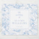 Elegant classic light blue chinoiserie porcelain floral pattern spring or summer wedding wine bottle labels with newlyweds last name.