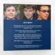 Simple modern graphic funeral program square shaped in a dark blue and white. Replace the sample text and twelve placeholder photos with your own special photos and memorial order of service, obituary, reading or poem, and acknowledgements, and personal information details. Other matching funeral keepsake remembrance items are available. Design by www.mylittleeden.com