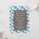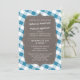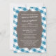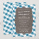 Southern country inspired rustic Wedding invitations designed with your custom printed ceremony details in light tan and white over a brown canvas texture illustration, on a blue and white gingham pattern.