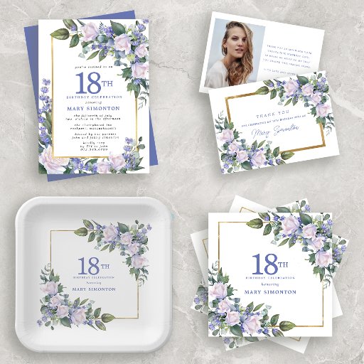 Honour a special woman with this elegant and feminine 18th Birthday party invitation. 18th is written in large blue text. Birthday celebration follows. The honoured guest's name is also in blue capital letters. The remainder of the text is soft dove grey. The birthday celebration details are surrounded by a chic gold frame that is decorated with white roses and blue flowers. The floral elements are nestled in deep green leaves. While it is a traditional design, the open and airy botanical foliage and text give it a contemporary vibe. The invitation back is a barely there deep blue.