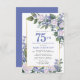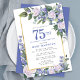 Honour a special woman with this elegant and feminine 75th Birthday party invitation. 75th is written in large blue text. Birthday celebration follows. The honoured guest's name is also in blue capital letters. The remainder of the text is soft dove grey. The birthday celebration details are surrounded by a chic gold frame that is decorated with white roses and blue flowers. The floral elements are nestled in deep green leaves. While it is a traditional design, the open and airy botanical foliage and text give it a contemporary vibe. The invitation back is a barely there deep blue.