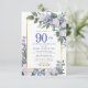 Honour a special woman with this elegant and feminine 90th Birthday party invitation. 90th is written in large blue text. Birthday celebration follows. The honoured guest's name is also in blue capital letters. The remainder of the text is soft dove grey. The birthday celebration details are surrounded by a chic gold frame that is decorated with white roses and blue flowers. The floral elements are nestled in deep green leaves. While it is a traditional design, the open and airy botanical foliage and text give it a contemporary vibe. The invitation back is a barely there deep blue.