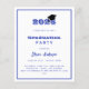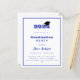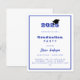 A modern and stylish invitation for a graduation party. For both him and her. White background, blue text and a frame. A black graduation cap.