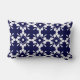Stylish personalised lumbar pillow features a modern geometric floral pattern in navy blue and white with "home sweet home" in handwritten script. A rich blue and white pattern inspired by Hamptons style decor, this stylish trendy pillow features customisable message on a simple plain navy blue banner with white striped accents. A trendy design that is bound to compliment any blue and white decor or Hampton style decor, or add a splash of customisable fashionable style to any room.