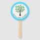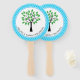 Family reunion hand fans with a family tree and black text fields for your family reunion information and a blue and white lattice pattern background.