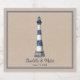 Designer Maura A. © for Sly Coconut Creative Designs. An elegant design featuring a one of a kind hand drawn lighthouse in a blue and white colour theme. The light kraft background texture is an image and is optional. The couple's name is in a modern brush script and date in a modern font. Fonts and their colours are customisable.
