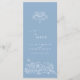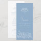 Dusty blue and white fleur de lis stylised spring or early summer wedding dinner menu. Edit this 4 course menu with your own meal option wording. Modern yet classical hand drawn fleur de lis and blossom, vines and butterflies art wedding menu. © Original hand drawing and design by Sarah Trett for www.mylittleedenweddings.com exclusively on zazzle.