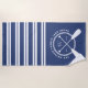 Preppy beach towel in blue and white for your lake house. Add your family name, initial, and the year established to a nautical monogram of crossed paddles over a rope circle. The beach towel also features blue and white stripes.