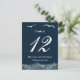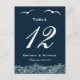 Blue & White Nautical Wedding Table Number Cards--feature a navy blue print with a design of white birds and ocean waves at the bottom. Matching wedding invitation suite found below. Use the personalise feature to the right to customise each table number card to your own details then add to cart. Return to this page & repeat for each table number card that you need.