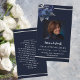 A dark blue background, a faux silver looking frame and space for your photo. Decorated with blue florals. Personalise and add name, dates and your text.