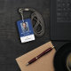 Vertical employee ID in blue and white. Add photo, logo, name, title, ID number.