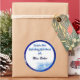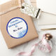 A custom baking or canning gift tag with letters decorated with snowflakes in blues on a white medallion against winter holiday art with an elegant pattern of pine boughs and pinecones in blue and white on an icy background of blues and violet.