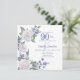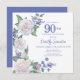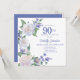 Honour a special woman with this elegant and feminine 90th Birthday party invitation. 90th is written in large blue text. Birthday celebration follows. The honoured guest's name is written in a modern script font. The birthday celebration details are surrounded by a chic open wreath that is decorated with white roses and blue flowers. The floral elements are nestled in green leaves. While it is a traditional design, the open and airy botanical foliage and text give it a contemporary vibe.
