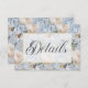 This wedding details card design features a beautiful soft periwinkle blue and white rustic floral pattern on a dusty periwinkle blue aged background. The text is displayed on a soft white transparent text area with a faux gold glitter frame. the back continues the floral pattern. This card is part of the Blue & White Rustic Floral Gold Frame wedding suite created by Simply Farmhouse Press.
