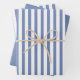 Coordinating gift wrap for all occasions. This is a simple stripes pattern in a blue and white all-over print. There are two sheets with stripes and one solid blue coordinating sheet.