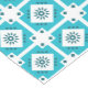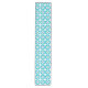 This table runner has a colourful southwestern style pattern in tones of sky blue, darker blue, and white. The square and diamond shapes combine with a sun symbol to make the interesting and cheerful pattern.