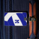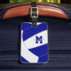 This volleyball themed luggage tag is suitable for a girl or boy and features the realistic image of an abstractly oversized volleyball that has blue & white panels - personalise with player name and monogram on the front, address and phone number on the back - by katz_d_zynes