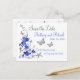 This nautical beach theme inspired wedding save the date post card has royal and navy blue metallic LOOK hibiscus type tropical flowers and decorative scrolls on it, along with silver grey metallic LOOK butterflies, starfish, a scalloped shell and a seahorse to complete the look. It would be perfect for a destination wedding, a beach wedding, or for anyone getting married in the tropics. It matches the wedding invitation shown below. ****If you change fonts, or the size of the font, some of the design and/or text may get cut-off. Everything will print as you see it on your monitor. I will not see changes you make, and Zazzle will NOT correct anything (typos, mis-alignment etc.). The text is all customisable. If you need help with this product, please email me BEFORE you place your order. If you require any other matching items, please email your request to niteowlstudio@gmail.com.