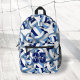This fun volleyball backpack features a random pattern of varied size light blue, dark blue & white volleyballs turned every which way on a white background - customise with the athlete's name & jersey number - by katz_d_zynes