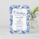 A wedding invitation featuring a blue and white floral toile design with calligraphy elements
