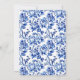 A wedding invitation featuring a blue and white floral toile design with calligraphy elements.