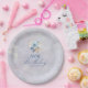 A beautiful bouquet of soft blue and white peonies decorate this birthday party paper plate. The birthday description is written in an elegant, traditional calligraphy. The birthday celebrant's name is written in a classic upright font. The background is a soft-bluish grey that contains a barely there botanical pattern and bokeh lights. This item is part of the Lush Blue and White Watercolor Floral collection. It contains DIY templates you can use to create a unique invitation suite and party supplies.