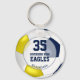 This custom soccer keychain for girls with blue and yellow school colours features a classic soccer ball with blue, yellow and white panels - customise the player's name and jersey number plus school and team mascot name - by katz_d_zynes