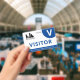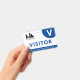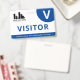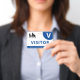 Horizontal visitor badge with a simple design in white and blue. A large white V makes it easy to quickly recognise the visitor. Personalise with your business logo.