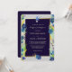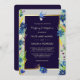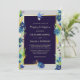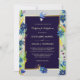 This pretty wedding invitation features side borders of blue and violet watercolor wildflowers. Scattered among the flowers are green leaves, gold and orange wild wheat sprigs, and blue and coral seed heads. At the top is a small blue bird with a bluebell blossom in it's beak. At the bottom is a small wildflower bouquet. Your text is in light gold at the centre, and placed on a dark blue section which is framed in gold. The flower border, bird image, and bouquet overlay the gold frame. Everything is placed on an elegant silver grey background. The back of the invitation is solid matching dark blue, and the small wildflower bouquet is repeated at the bottom. Elegant, modern, and appropriate for weddings in any season!
