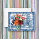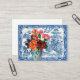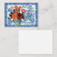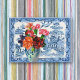 Colourful flowers in a vase are posed in front of a traditional blue willow design. The blue patterns of the vase echo the colours and style of the Asian inspired backdrop. The bright flowers have a contemporary look even though they were printed on an antique, Victorian trade card. This beautiful image can decorate invitations, announcements and the interior of your home.