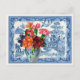 Colourful flowers in a vase are posed in front of a traditional blue willow design. The blue patterns of the vase echo the colours and style of the Asian inspired backdrop. The bright flowers have a contemporary look even though they were printed on an antique, Victorian trade card. This beautiful image can decorate invitations, announcements and the interior of your home.