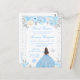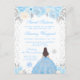 This elegant and glamourous winter sweet sixteen birthday invitation features a beautiful princess with brunette hair and fair skin in a blue ball gown. The text combines handwritten script and modern sans serif fonts for a classy and sophisticated look. The floral arrangements, snowflakes and silver confetti create the perfect blend of rustic and chic.