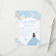 This elegant and glamourous winter sweet sixteen rsvp card features a beautiful princess with brunette hair and fair skin in a blue ball gown. The text combines handwritten script and modern sans serif fonts for a classy and sophisticated look. The floral arrangements, snowflakes and silver confetti create the perfect blend of rustic and chic.
