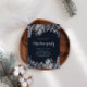 Winter foliage illustration on the top and bottom in shades of grey and blue paired with a white script for all your information on a dark blue background. Check our store for more Christmas party invitation options.