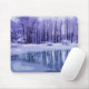 This fine art mousepad presents a seasonal winter landscape in shades of blue, violet, grey, white and purple. The trees are bare. Ice covers part of the water but lovely reflections of trees, clouds and sky shine through to form an abstract pattern. Snow surrounds the pond.