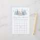 Sophisticated classic "Bingo" game designed for a baby boy shower, adorned with a charming teddy bear wearing a cute blue bow, holding a blue balloon, surrounded by winter pine trees and snowflakes. Engage your guests with this delightful game, perfect for adding fun and excitement to your winter celebration while creating cherished memories.