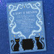 Cute Witch A Baby is Brewing Halloween Baby Shower invite features adorable illustrations of black cats, a cauldron,and stars against a blue background.