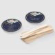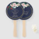 Elegant wedding themed program fan done in a dark regency blue, with gold rings, around the edge, decorated with colourful painted flowers, at the top. Personalise the custom text to read what you want.