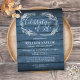 A rustic celebration of life remembrance invitation postcard featuring a hand-drawn foliage garland on a blue wood panels background. Designed by Thisisnotme©