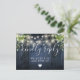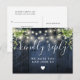 A string lights rusticd blue barn wood with greenery boho RSVP card with chic typography. The reverse features your details and a fun guest song request. Designed by Thisisnotme©