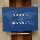 Dark blue and yellow world map round wedding guestbook for a destination wedding.