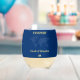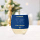 Blue and yellow passport destination wedding wine glass with world map. Personalise it with your name. Also great for a pilot, a vacation or a frequent traveller.