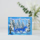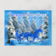 Snow laden trees in the background, lamp with holly entwining it and a whimsical blue harness horse and driver in cart in the foreground.