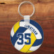 This boys' volleyball keychain features a blue, yellow and white volleyball upon which you can customise the player's name and jersey number - by katz_d_zynes