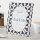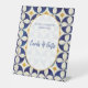 This design features rustic vintage Portuguese tile patterns. The wedding text is elegantly framed with a white and gold colour oval arch shape. Unique Azulejo blue, yellow and white geometric floral wedding cards and gifts sign design with modern elements. Matching wedding invitations and other stationery items are also available.