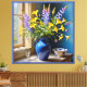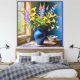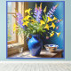 Blue Yellow Purple Bouquet Art. Capture tranquillity with this serene stylised watercolour still life of flowers in a vase with delicate blooms in blues, yellows, and purples. Perfect for wall art and greeting cards.