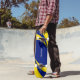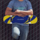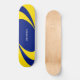 Blue and yellow wavy lines with blue centre and calligraphy Skateboard.