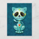 This adorable blue kitten design is decorated with swirls and dot patterns. Yellow flower pedals circle the pure black eyes in the tradition of the Day of the Dead sugar skulls. The cat is sitting down, looking forward with its tail waving in the background. The over sized head sits on a tiny body which creates a playful, cartoon like appearance. A five point star sits in the middle of the kitten’s forehead while a bright red and yellow heart appears in the centre of the chest. This cute little cat is a fun and stylish design inspired by the beautiful patterns of Day of the Dead sugar skulls.